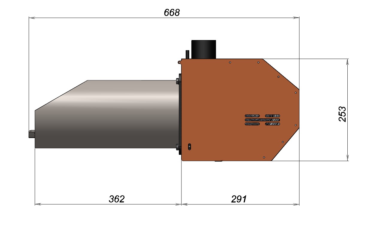 Принцип действия горелки состоит в следующем: в специальном бункере пеллета подается в горелку через шнек внешней подачи, внутренний шнек горелки выталкивает пеллету на колосник в камеру сгорания, вентилятор подает достаточное количество воздуха для ее сгорания, а специальные датчики контролируют процесс сгорания топлива.