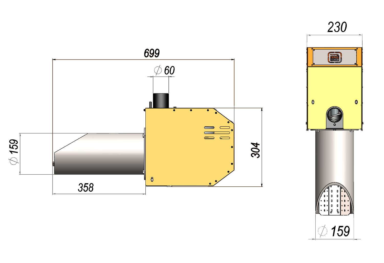 Принцип действия горелки состоит в следующем: в специальном бункере пеллета подается в горелку через шнек внешней подачи, внутренний шнек горелки выталкивает пеллету на колосник в камеру сгорания, вентилятор подает достаточное количество воздуха для ее сгорания, а специальные датчики контролируют процесс сгорания топлива.