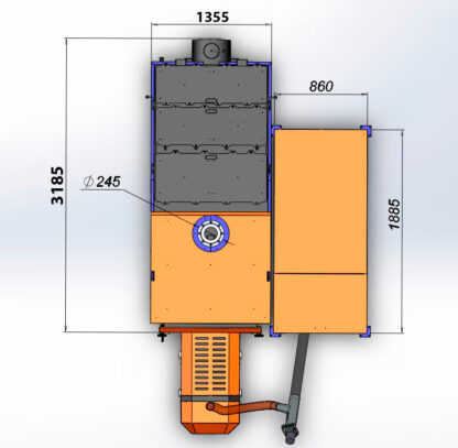 Модель, рассчитанная на 400 кВт, так же как и все наши пеллетные котлы длительного горения, работает с КПД до 92%. Такие показатели достигаются благодаря специальной трехходовой, вертикальной, жаротрубной конструкции теплообменника. Его вертикальное расположение добавляет удобства, поскольку при таком положении, при сжигании пеллеты засорение происходит не так быстро.