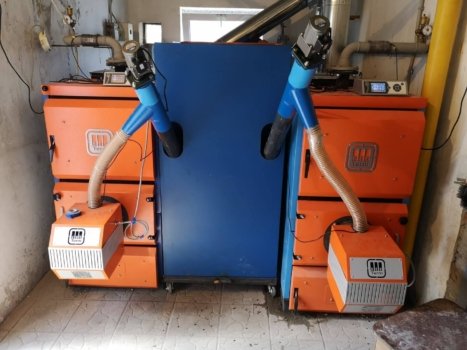 Пелетні котли BEETERM P-P 100 кВт з одним загальним бункером встановлені для опалення промислових складів площею 2500м2