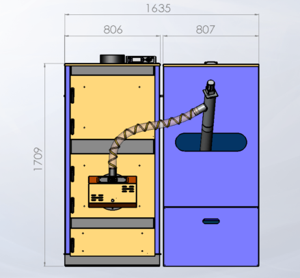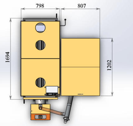 Стандартний бункер для пелет, який йде в комплекті до генератора, розрахований приблизно на 2-3 дні автономної роботи. Бункер можна розташувати зліва, справа або перед ТГ, що дуже зручно, коли топкова має обмежений простір і не завжди можна розташувати обладнання так, як хочеться.