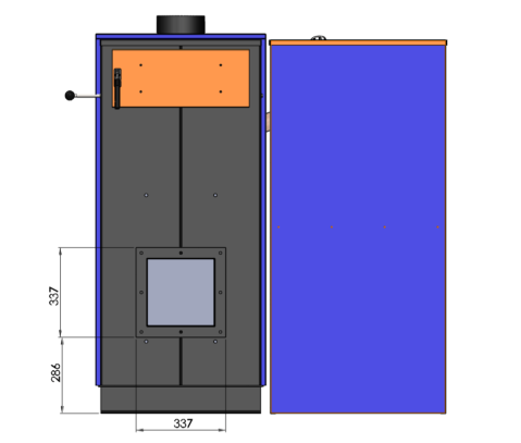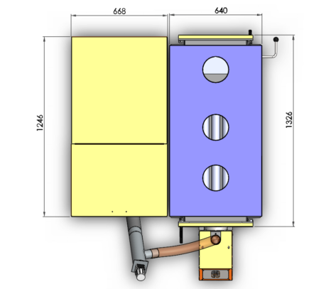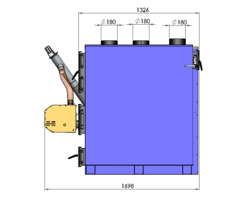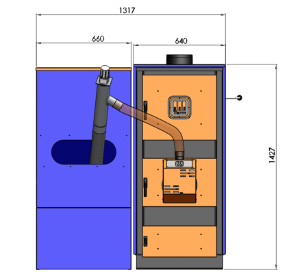 Стандартний бункер для пелет, який йде в комплекті до генератора, розрахований приблизно на 2-3 дні автономної роботи. Бункер можна розташувати зліва, справа або перед ТГ, що дуже зручно, коли топкова має обмежений простір і не завжди можна розташувати обладнання так, як хочеться.